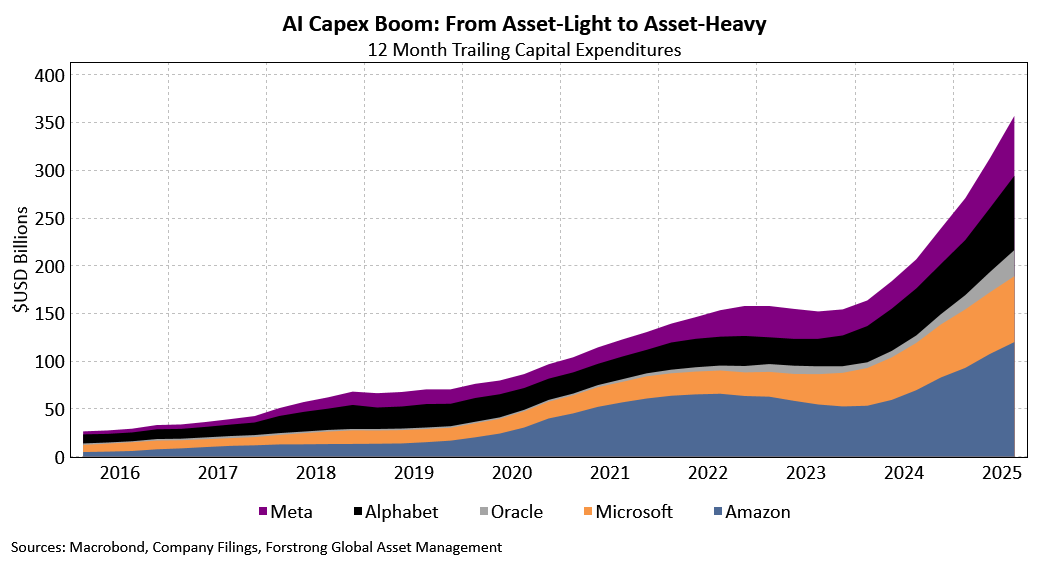 Meanwhile, a different dynamic is unfolding elsewhere. Trump’s “America First” agenda has forced other nations to respond — with higher fiscal spending, competitiveness reforms, and fresh trade alliances. We’ve written extensively about this “Protectionist Paradox”, which is now reshaping global investment flows. Policymakers abroad see AI not as America’s advantage but as the great equalizer. The uneven recovery of recent years has laid the groundwork for a powerful global broadening.