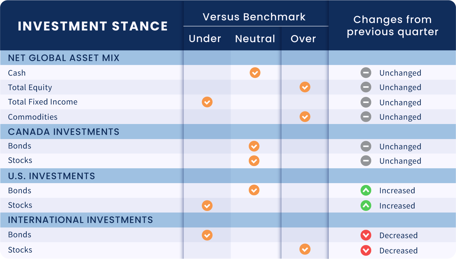 • Fixed income exposure remains modestly underweight this quarter.