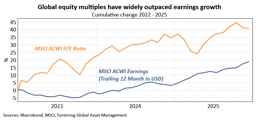 What does this mean for global equity markets? Per the chart below, the bull market of the past few years saw valuations meaningfully outpace underlying fundamentals. While valuations generally provide limited guidance on short to medium-term price movements (they are much more effective over a long time horizon), we nonetheless expect future returns to be driven more by earnings trends than continued multiple expansion. A modest growth slowdown should not derail corporate earnings growth, but expectations may need to be tempered somewhat.