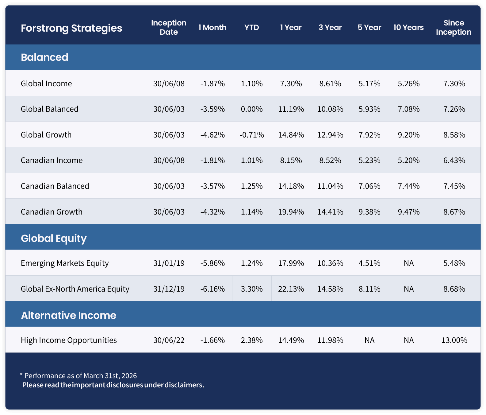 Certain statements in these materials may contain forward-looking statements or forward-looking information that are predictive in nature and may include words such as “expects”, “anticipates”, “intends”, “plans”, believes”, “estimates”, and similar forward-looking expressions or negative versions thereof. Such forward-looking statements are based on current expectations and projections about future general economic, political, and other relevant market factors, such as interest, and assuming no changes to applicable tax or other laws or regulations. Expectations and projections about future events are inherently subject to, among other things, risks and uncertainties, some of which may be unforeseeable and, accordingly, may prove to be incorrect at a future date. Forward-looking statements are not guarantees of future performance, and actual events could differ materially from those expressed or implied in any forward-looking statements. A number of important factors can contribute to these differences, including, but not limited to, general economic, political, and market factors in Canada and internationally, interest and foreign exchange rates, global equity and capital markets, business competition, and catastrophic events. You should avoid placing any undue reliance on forward-looking statements. Past performance is no indicator of future performance and the materials are not intended to forecast or predict future events. Forstrong disclaims any and all responsibility to update any forward-looking statements, whether as a result of new information, future events, or otherwise, except as specifically required by law.